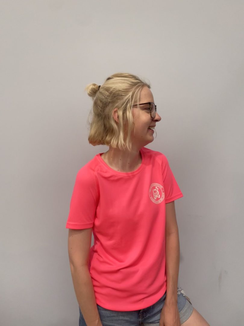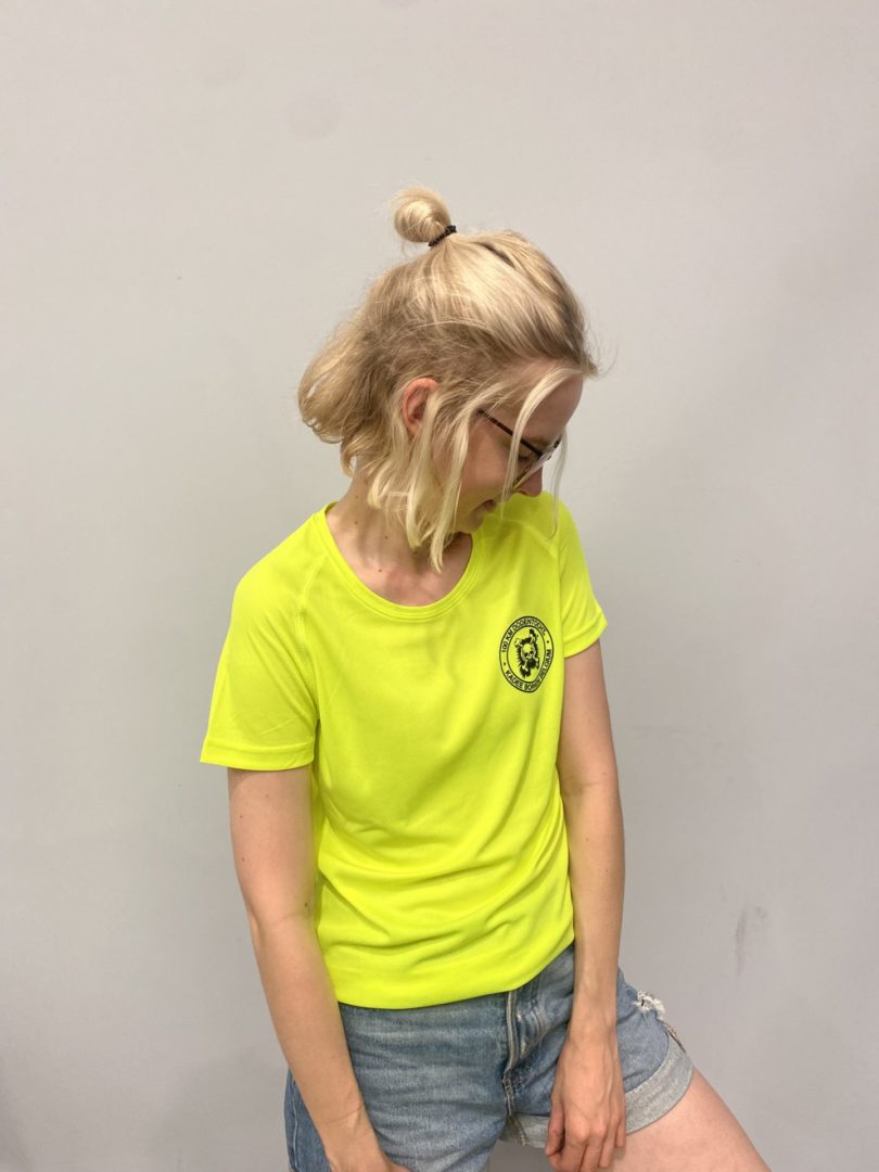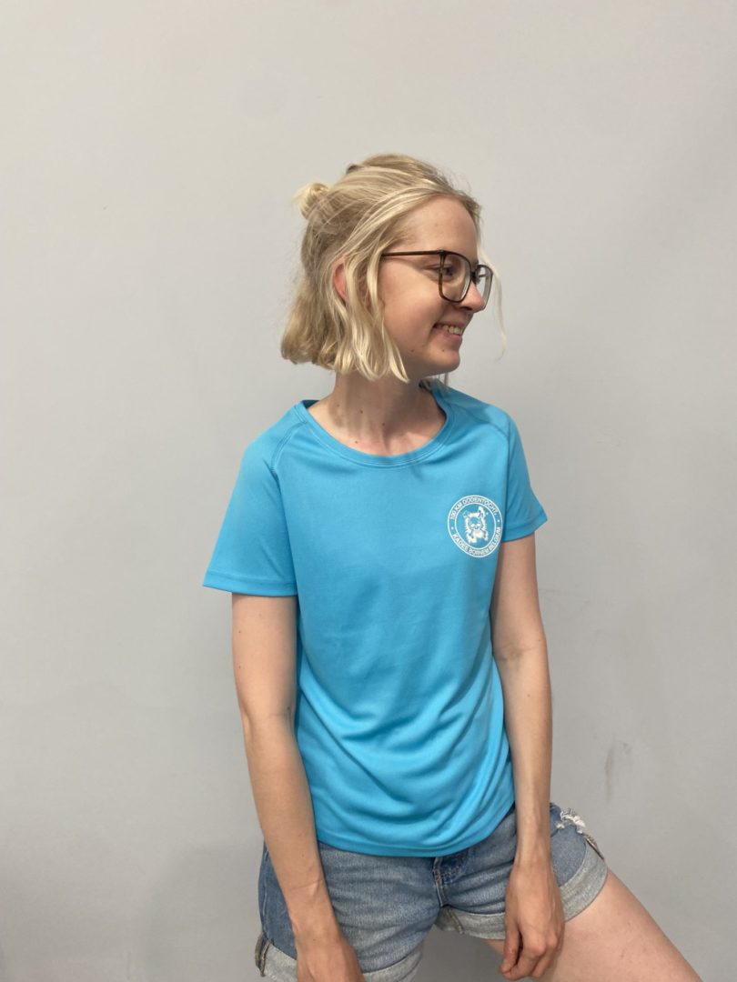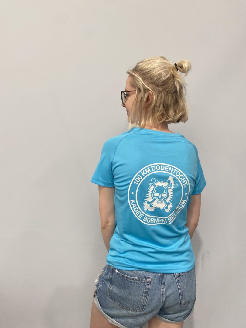 Sneldrogende stof. Nektape. Raglanmouwen met overlocksteek.