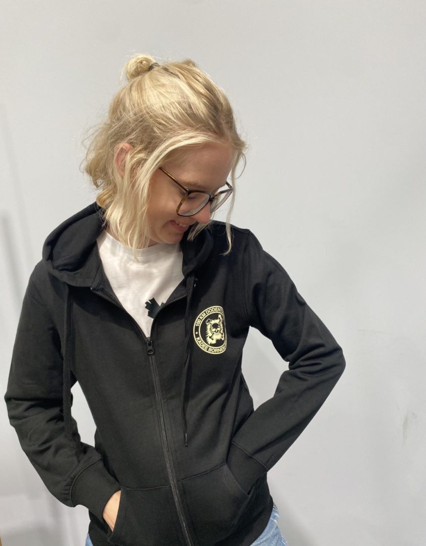Kangoeroezak, ritsluiting in nylon. Gevoerde capuchon in jersey-polykatoen met platte aanrijgkoordjes.